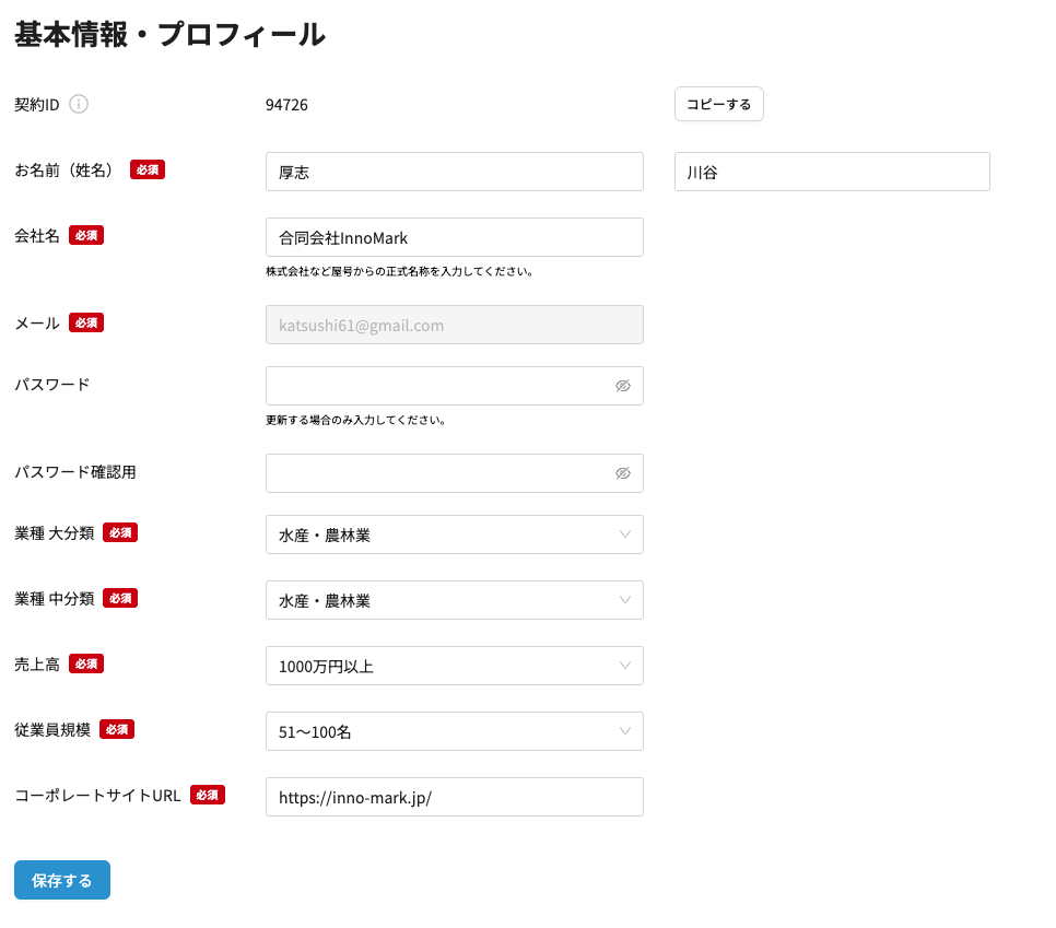 - 画面左の「プロフィール」をクリックし、「基本情報」をクリックするとプロフィール変更画面へ推移します。
