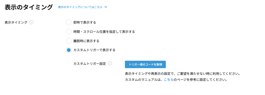 DataPushのポップアップ設定画面には、「表示のタイミング」という項目があり、その中には「カスタムトリガーで表示する」というオプションが含まれています。サイト上の設定で対応できない動きを実装したい場合に使用します。
